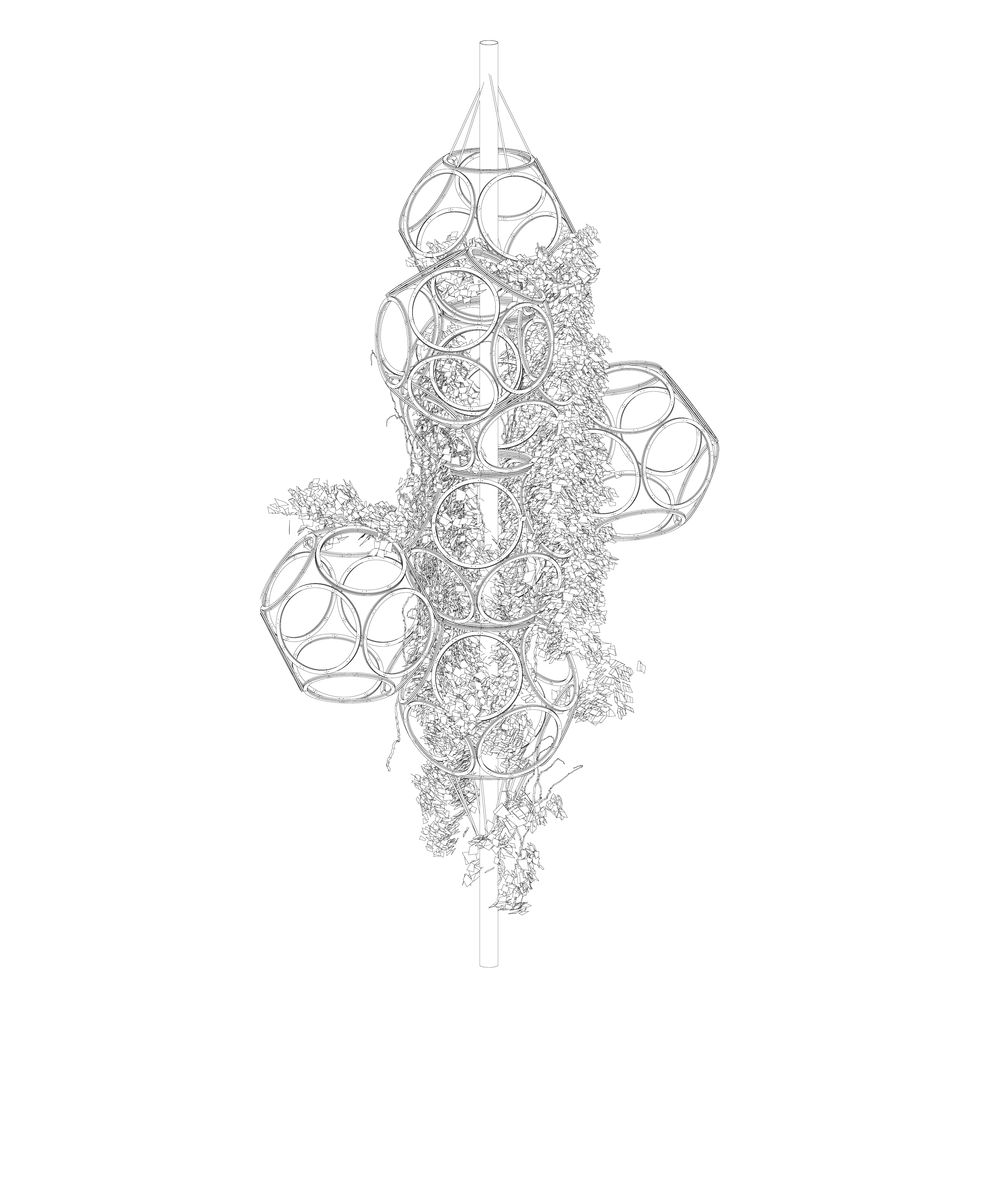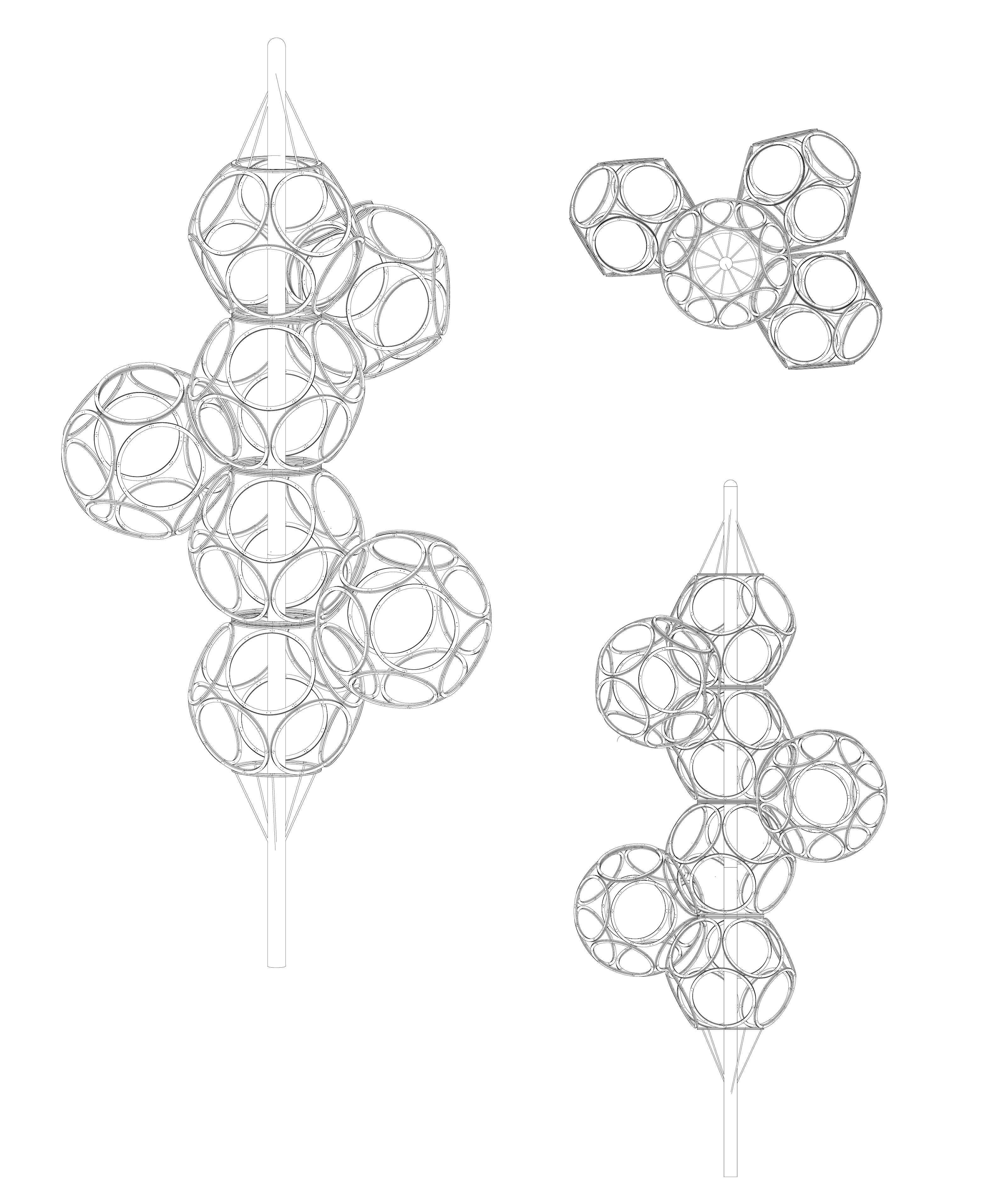 At its core, the system uses interconnected circular rings arranged in a dodecahedral configuration. This geometry provides structural stability while remaining open and permeable for plant growth, light, and air. The result is a lightweight framework that defines space without enclosing it.