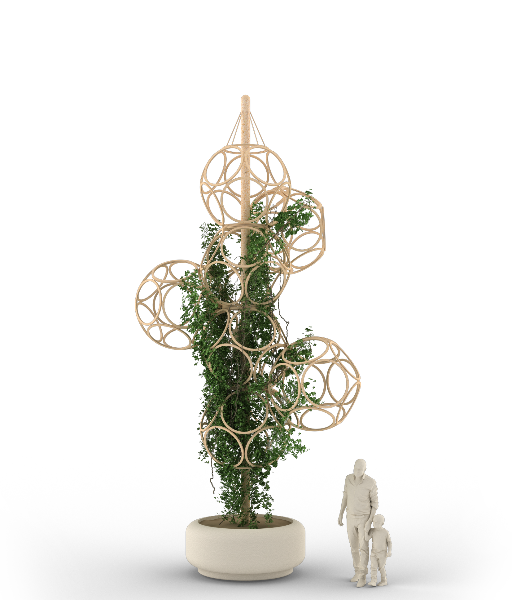 The Dodecahedron Tree is a vertical trellis structure based on a modular dodecahedral geometry. It is designed to support climbing plants in three dimensions, allowing greenery to grow upward, outward, and around the structure.